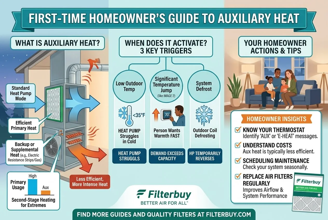 That "AUX HEAT" light just lit up on your thermostat — and your first instinct is to wonder if something broke. After manufacturing HVAC filtration products for over a decade and helping more than two million households navigate their heating systems, we can tell you this: what does auxiliary heat mean is one of the most searched and least understood questions about a home heating system, and first-time homeowners encounter it more than anyone.